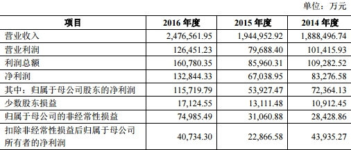 数据显示,中铝国际2013年至2016年营业收入分别为1,814,475.17万元、1,888,496.74万元、1,944,952.92万元、2,476,561.95万元;归属于母公司股东的净利润分别为172,656.29万元、72,364.13万元、53,927.47万元、115,719.79万元;扣除非经常性损益后归属于母公司所有者的净利润分别为35,885.87万元、43,935.27万元、22,866.58万元、40,734.30万元。