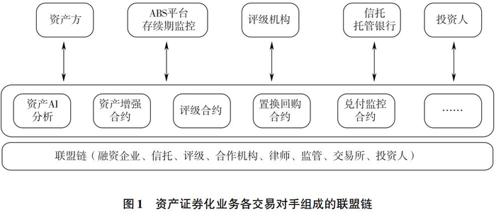 资产证券化作为使得流动性较低的资产通过一些结构性调整与重组,使之能够于金融市场中流通、转让的新型融资技术,是金融市场长期发展实践和金融创新的重要产物,自诞生起就对盘活金融市场、促进资金融通、提高资金配置效率起到了极为重要的作用。从操作流程来看,涉及以特殊目的机构(SPV)为核心连接发起机构和投资者的一条完整的资金流通链条,并且以该链条支撑起资产证券化的基本架构,此外,还有其他机构提供信用增级与信用评级、证券的登记结算以及法律和会计等专业服务。由此可见,资产证券化业务具有交易结构复杂、参与方众多、流程繁多,多方之间的信用成本较高,资产的透明度有限,资金方往往无法对资产信息有全面详尽的了解,信息获取成本高昂等问题。而区块链平台能够有效解决资产证券化业务中存在的这些问题:通过机器以及公允的代码,将人与人之间的信任进行转移,实现了人对机器和算法的信任,构建一个信任的计算网络。从两者的本质来看,资产证券化业务和区块链技术具有天然的契合性。