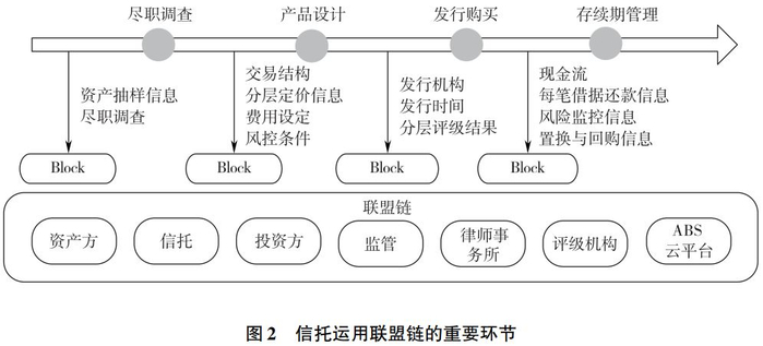 信托行业发展资产证券化业务有利于实现创新转型,拓展新的业务增长点,相比金融同业,信托公司在资产证券化领域的主要优势有以下三个方面:第一,信托制度本身的优势。信托关系实际上是一种特殊的财产管理关系,其中信托财产具备独立性。在资产证券化过程中,信托通过设立特殊目的信托作为发行载体,将基础资产隔离于发起人的其他资产,保证所发行的资产支持证券的信用基础是基于隔离出来的基础资产的信用而非发起人本人的信用;第二,信托公司的全流程资产管理能力。信托行业是跨资本市场、货币市场、实业投资展业的金融行业,信托公司可以对资产证券化项目存续期间基础资产、证券化项目整体交易结构设计、原始权益人或资产服务机构提供全程服务、监督和管理;第三,对资产证券化业务的前段延伸。信托公司通过投资或融资等多种方式直接持有具备证券化潜力的资产或为合作伙伴提供资金支持,并在此期间对基础资产进行培育,以专业化的能力提升基础资产的整理质量,以在合适的时机促成更多的基础资产符合条件后进行证券化,从而进一步丰富资产证券化市场的资产来源。综上所述,信托作为关键性参与方,在尽职调查、产品设计、发行购买、存续期管理等重要环节合理运用区块链,可以达到提高资产信息透明度、增强非标资产的信息披露,满足穿透式监管要求、降低投资者风险,降低企业融资成本、通过智能合约,提高运行效率,降低企业融资周期等优势。