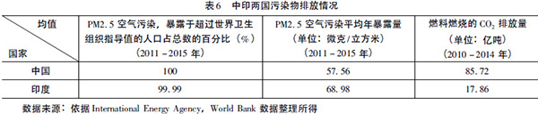 国际能源署公布的来自燃料燃烧的二氧化碳排放量年度出版物是各国学者和政策制定者的重要工具,其中的数据采用国际能源机构能源数据库和2006年IPCC(政府间气候变化专门委员会)国家温室气体清单指南的默认方法和排放因子计算而得,参考价值较高。表6 显示,中国燃料燃烧的二氧化碳排放量远高于印度。事实上,中国是世界上温室气体排放量最多的国家,2014年印度位居全球第三,但排放量远低于中国,仅为中国的22. 23%。此外,可发现,中国空气中PM2. 5(直径小于或等于2.5微米的颗粒物)含量低于印度,但超过世界卫生组织指导值的范围较印度稍高。