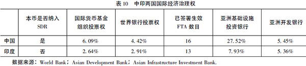 2008年国际金融危机后,新兴市场国家经济的良好表现为世界经济复苏作出了突出贡献。以新兴市场为代表的发展中国家积极推动国际经济治理体系的改革,其代表性和发言权整体得到提高。通过改革后的最新数据可发现,作为全球经济增长引擎,中国国际经济治理权方面表现比印度更为优秀(见表10)。