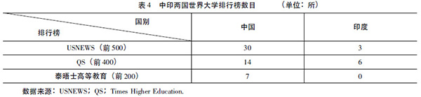 观察表4发现,中国高校教育与印度相比优势明显,位列世界大学排行榜前列的大学数量更多,质量也更高。随着“双一流”(世界一流大学和一流学科)新一轮高校建设方案的全面展开,中国高等教育的质量势必上升一个新台阶。