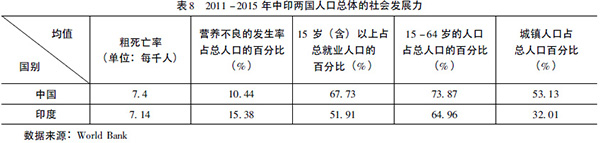 中国经济发展水平相对较高,人们有能力购买更好的生活与医疗服务。表8显示,中国营养不良发生率和粗死亡率均低于印度;位于全球普遍就业年龄段(15-64岁)的人口占总人口比例与相应年龄段的就业率都比印度高,有望实现预定经济发展目标。同时,也正因为经济的良好表现,不断高速发展的城市吸引了大量来自农村的劳动力,城市化率(城镇人口占总人口百分比)已超过50%,远高于印度,并逐渐向发达国家靠拢。