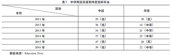 全球性私人教育机构英孚教育(Education First)自2011 年起每年定期发布一版英语熟练度指标,该指标依据各国共计数十万成年人的测试结果进行汇编统计,并将结果划分为“极高”至“极低”五个等级,样本代表性好,具有较强的证明力。根据表5,印度英语熟练度指标六年中有五年排名比中国靠前,大多具有中等及以上的英语熟练度,而中国一直在低等水平徘徊,印度这方面强于中国,这很可能是印度将英语与印地语同列为官方语言的缘故。
