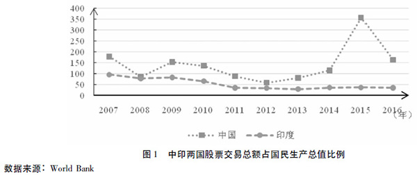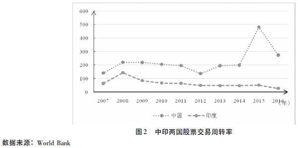 原因是,中印两国股市结构不同,中国股票市场具有多层级的结构特征,既包括准入门槛高的主板市场,也包括未纳入统计的中小板、创业板、新三板、四板等多种其他类型市场。相对来说,印度的证券交易所的主板市场上市门槛相对较低,具有发展潜力的中型企业也能在主板上市,若按印度标准,中国符合上市条件的企业规模高于印度。图1显示,中国股票交易总额占国内生产总值比例高于印度。而根据图2,印度股票交易周转率远低于中国,中国股票市场的活跃度更高。