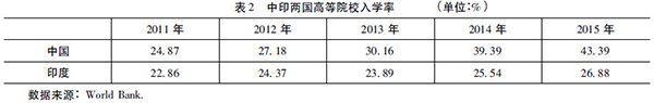 中高等院校入学率作为衡量一国人力资源结构的良好指标,具有较强的参考意义。表1 显示,中国中等院校入学率每年超过印度20%以上,优势明显。根据表2,近年来中印两国高等院校入学率均呈增长态势,但印度增长较为缓慢,甚至在2013年出现下降,与中低收入水平国家差距不大,而六年来,中国高等院校入学率增长迅速,逐步向中高收入国家的平均水平靠拢,印度与中国的差距较大。