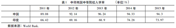 2015 年,中国成人识字率已达到96. 36%,而印度仅为72. 23%,可见,印度扫盲教育依然压力巨大。近年来,因印度政府大力开展扫盲教育,初等教育入学率均高于100%,故此项指标无可比价值。