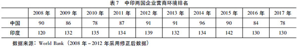 观察表7发现,近十年来,尽管中印两国营商环境都存在一定波动,但无明显好转或恶化,整体来看,中国营商环境远优于印度。个体构成的人口总体状况对社会软实力拥有重大影响,并进一步作用于经济软实力。