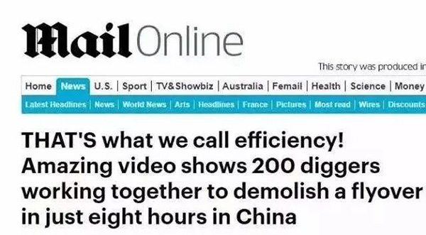 令全球惊叹“中国速度”已不是第一次出现。早在2017年,一段挖掘机在8小时内拆除立交桥的视频就曾震惊世界。江西南昌龙王庙立交桥的拆除工作从2017年6月30日晚9点开始,到7月1日凌晨5点就已完工。这件放在过去可能会进行数个月的工程,在8个小时内完工,这样的高效也震惊了外媒。