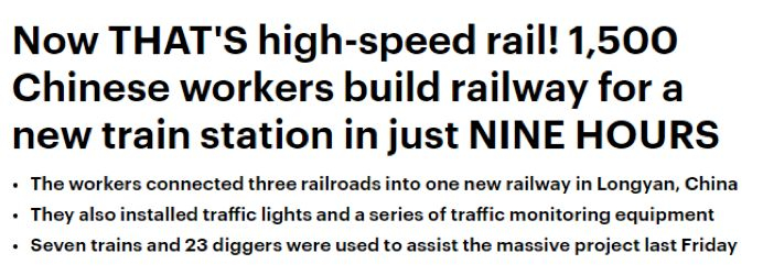英国《每日邮报》发文感叹:“这才是高铁!1500名中国工人在短短9小时内为新火车站修建铁路。”