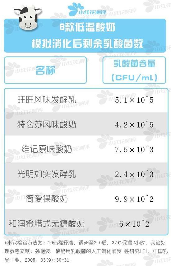 结果显示,经过模拟胃部消化实验后,大部分酸奶的乳酸菌所剩无几,均低于106CFU/g(mL)。比较夸张的是,维记在包装盒上宣传每盒(200g)含有600亿的活性乳酸菌(即3亿/ml),结果“一进肚”就3亿变7000了。