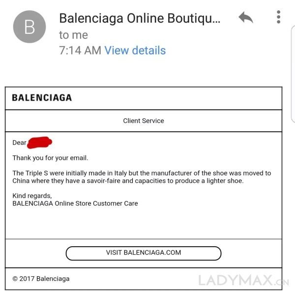 图为Balenciaga回复消费者的官方邮件