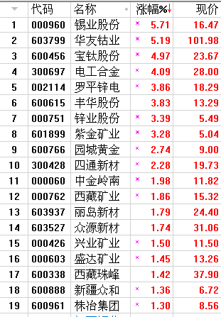 从昨日的有色板块来看,锡业股份、宝钛股份、锌业股份、紫金矿业涨幅不错。石油板块的潜能恒信、广汇能源、洲际油气涨幅也不错。