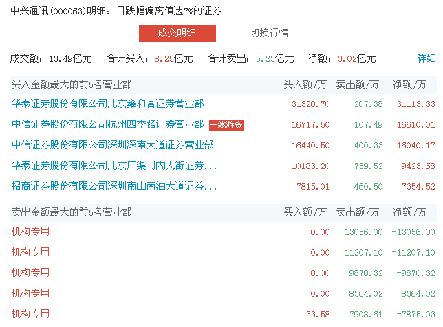 ▲中兴通讯29日龙虎榜一览