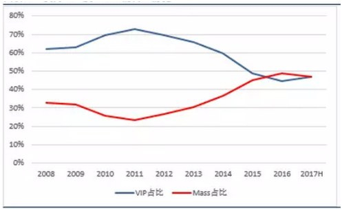 撇开该事件影响,博彩行业目前正走在复苏的路上。博彩项目主要分为贵宾厅(VIP)业务和中场(Mass)业务,其中中场又分为高端中场(Premium Mass)和普通中场(Base Mass)。受政策影响,VIP业务前两年大受挫折,但从去年第二季度开始,VIP出现了超预期的强劲增长,根据机构的观点,在宏观预期向好、Junket市场复苏等背景下,预计其增长动能依然能保持2018年全年。中场业务自2012年来占比不断上升,目前体量已和VIP相当,是重要的发展方向。