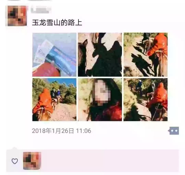 骑马上山,两个姑娘以为马上可以一睹雪山真容,陈澜激动万分,还发了朋友圈:玉龙雪山的路上……