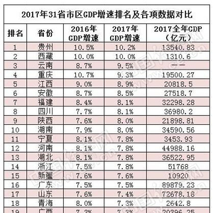 2017年31省区GDP增速排行榜。