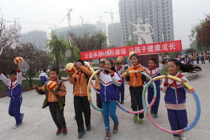 在“公益体彩 快乐操场”活动淄博捐赠仪式上,张店区房镇镇中心小学的孩子们挑选了自己喜爱的体育器材