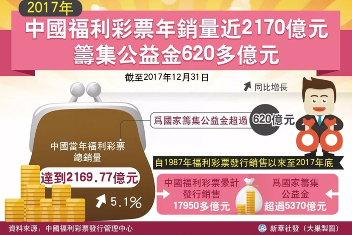 统计显示,1987-2017年的30年间,我国累计销售彩票约3.2万亿元。其中,销售福利彩票近1.8万亿元,体育彩票超过1.4万亿元。