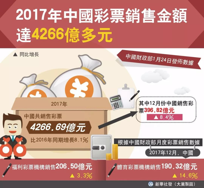 从2017年数据看,我国共销售彩票4266.69亿元,其中福利彩票机构销售2169.77亿元,体育彩票机构销售2096.92亿元。两大机构共筹集彩票公益金1143.26亿元。