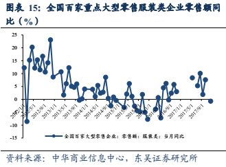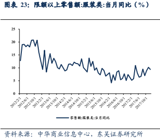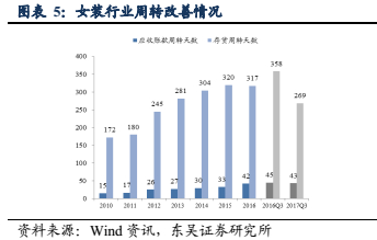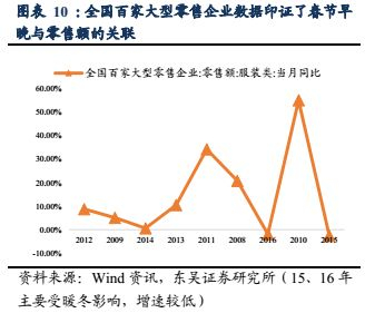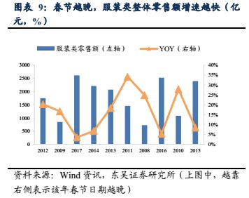 3)17年北方冬季较冷叠加18年春季较晚,利好纺服业整体销售。一方面由于今年北方冬季较冷,各品牌17年四季度零售情况良好,我们认为这将对各品牌17Q4报表收入带来提振;另一方面18年春节较晚有望利好18年一季度销售,这主要是由于元旦至春节之间往往是高毛利冬装的销售旺季,而春节的提前则会缩短这一黄金销售时间段;同时春节之后由于假期的结束,消费需求往往相对较淡,因此春节的前后对整个Q1的销售有着较大的影响。我们从数据上也能观察到这一情况的出现。除去受到暖冬影响的15、16年,其他年份这一趋势均较为明显。