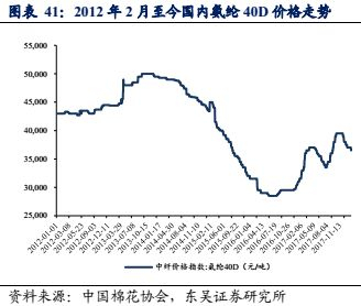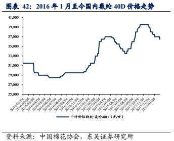 氨纶40D :36,800.00元/吨(-0.54%) (本周变化-200.00元/吨,本月变化-1000.00元/吨,过去一年变化+35,300.00元/吨)