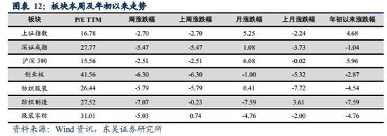 本周上证综指下跌2.70%,深证成指下跌5.47%,沪深300下跌2.51%,创业板指下跌6.30%。具体到纺织服装行业,本周行业指数下跌5.79%,其中纺织制造下跌7.07%,服装家纺下跌5.03%。