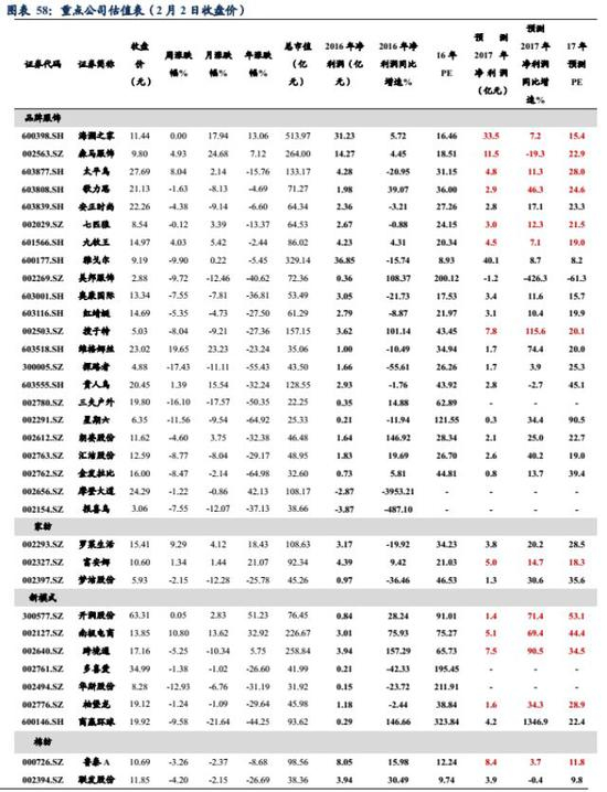 海澜之家:在三季度以来不断做出包括与收购UR股权、阿里成为合作伙伴、收购英氏婴童股权等布局,其向外延伸打造品牌管理集团的思路逐渐明晰。同时公司主品牌四季度零售呈现双位数增长、爱居兔展店同时同店仍有双位数增长,新增JEANS/AEX/ OVV等差异化定位子品牌不断拓展品牌矩阵。我们预计其17/18/19年净利润为33.5/37.2/41.5亿,对应市盈率15/14/12倍,低估值高分红白马龙头,值得关注。
