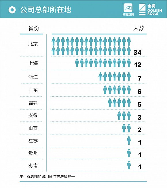 从互联网富豪的公司所在地上看,总部位于北京、上海的互联网公司最容易出产富豪。其中,34位互联网富豪的公司总部位于北京,12位互联网富豪的公司总部在上海,7位互联网富豪的公司总部在浙江,6位互联网富豪的公司总部在广东。