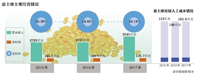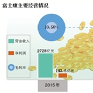 在净利润方面,富士康2015-2017年分别为143.5亿元、143.7亿元和158.7亿元,其中2016年净利润较2015年增长0.11%,2017年净利润较2016年增长10.45%。