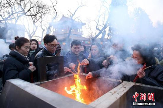 2月16日,民众在烧香祈福。当日,正值农历狗年正月初一,在北京雍和宫,大批市民赶在新年烧头柱香祈福。中新社记者 韩海丹 摄