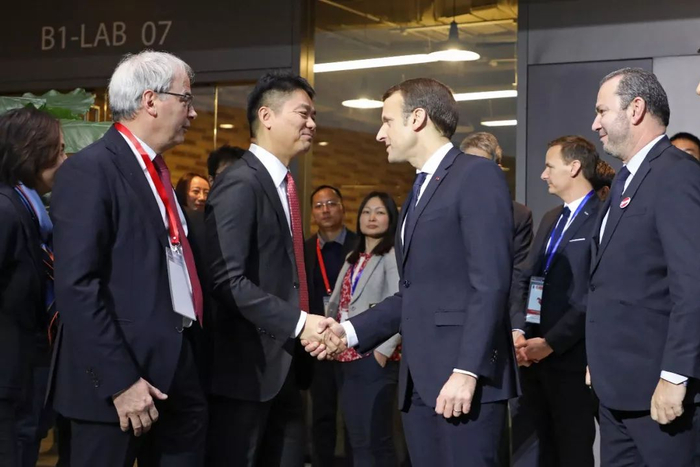 刘强东和法国总统马克龙握手。@视觉中国