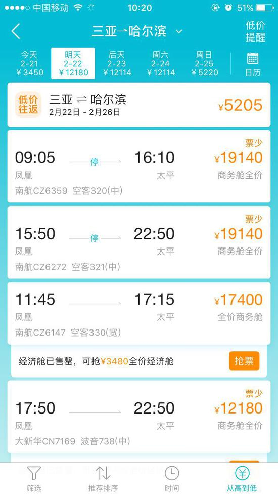 三亚返京机票暴涨近10倍 返哈尔滨机票高达2万元