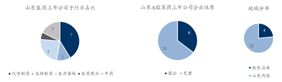 山东医药上市公司17家,占山东所有上市公司总数的9.5%,山东确实为名副其实的“医药大省”。山东医药上市公司数量占A股所有医药上市公司数量的比例为6%,市值占比为5%。在这些医药上市公司中,化学制药、医疗器械及中药是主要子行业,其中:化学制药7家、医疗器械4家、中药3家、生物制药2家、医药流通1家。从所属地区来看,沿海胶东半岛4家,齐鲁内陆地区13家。从企业性质来看,国企6家,民企11家。