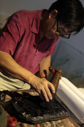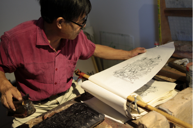 年画200张为一“块”。印时将纸张按不同的张数按“块”夹在自制竹夹上。纸夹牢后,一头插入“管钉”,一头置于自制灰砖槽中,纸折叠呈“S”状。印黑线版需双手用力,线条才清晰,瓷实。整套动作和过程,要求眼明手快、手眼密切配合,必须全身心投入一丝不苟。