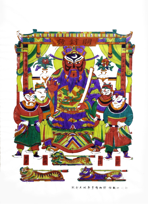开封朱仙镇木版年画刀技线条粗犷豪放,阴粗阳细,阴阳对比性较强。尤其是在神像画的衣纹上表现更为突出,有乡土气息,具有北方民族的纯朴、厚实、健壮、整洁的艺术风格。