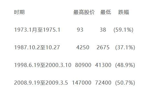 伯克希尔公司本身就极好地说明了短期的价格随机波动,可能掩盖长期的价值增长。在过去的53年当中,伯克希尔通过将盈利进行再投资并让其产生复利的方式创造了奇迹。年复一年,我们砥砺前行。但是,伯克希尔股票仍然经历了4次重挫,以下就是惨案的细节:
