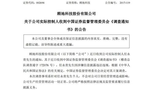 2017年12月,公司实际控制人任永青因涉嫌信息披露违法违规,证监会决定对其立案调查。