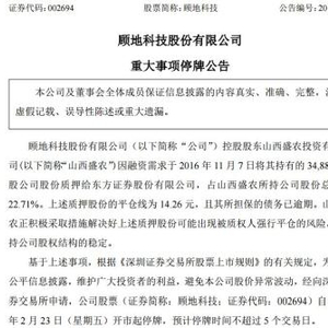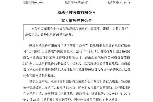 22日晚间,顾地科技发布停牌公告称,公司控股股东山西盛农质押给东方证券的股份的平仓线为14.26元,目前公司股价已接近平仓线,且其所担保的债务已逾期,因此申请停牌。