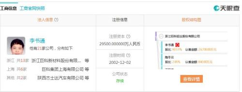 天眼查显示,2002年,李书通置换上海杰士达汽车有限公司等四家公司,于当年8月撤资回归台州,创办浙江巨科铝业股份有限公司。目前他拥有21家公司。