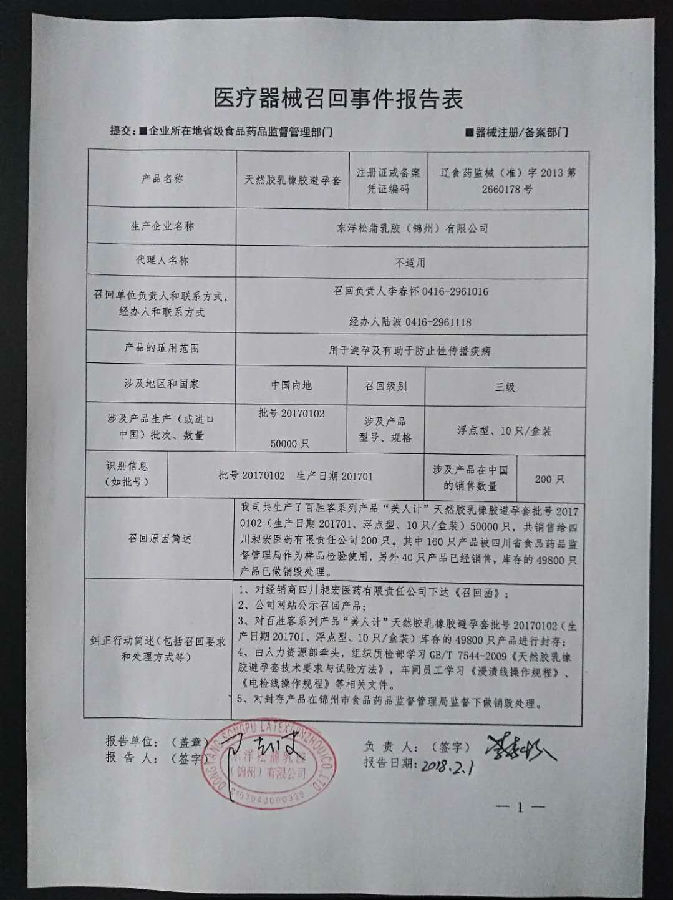东洋松蒲乳胶(锦州)有限公司对天然胶乳橡胶避孕套主动召回