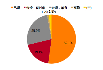 样本已婚人口超过50%,未婚人口占比45.0%,其中未婚但有对象人口占比19.1%,未婚单身人口占比25.9%。