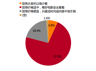 整体看30元票价被大多数人接受。根据猫眼专业版数据,2017年剔除服务费后全国平均票价32元,其中一线城市平均票价39元、二线城市32元、三线城市和四线城市30元。在调研样本中,72.3%的人认为30元的票价适中。其中有不同城市影响,如一线城市平均票价是远高于30元,但整体看30元票价仍在大多数人的接受范围之内,月收入5000元以下的样本仍有只有9.9%比例认为票价太贵。另外,在月收入3万以上的人群,超过20%认为价格便宜,只是没时间或者内容不吸引,因而对于观影习惯成熟地区,优质内容将为主要驱动力。