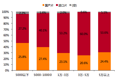 在影片类型上,64.5%样本选择了更偏爱进口片,从收入水平分拆看,月收入1-3万为分界线,喜爱进口片占比超过50%,月收入5000元以下偏爱进口片和国产片的比例差距不大。