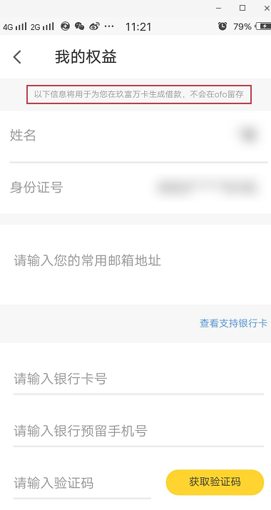 随即,财经网创投梳理了退押金的流程,点击“留下来”则页面未进行任何操作,点击“立即申请”则进入了网友所说的绑卡环节,值得留意的是,ofo APP界面在最顶端有一行小字说明“以下信息将用于为您在玖富万卡生成借款,不会在ofo留存”。