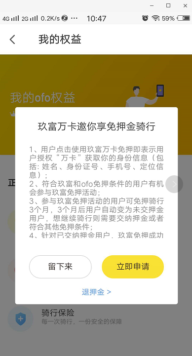 按照字面意思理解,似乎点击“立即申请”的用户,并非都可百分百享受免押金服务,且可享受到该服务的用户,只能享受3个月的期限,期限过后用户自动变为未交押金用户,想继续骑行则需交纳押金或者符合其他免押条件。但毫无疑问,在这个过程之中,用户已经绑定了玖富万卡。