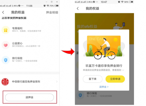 根据此消息,财经网创投随即在ofo App内进行退押金操作,操作流程显示,当点击退押金时,会弹出以下界面。