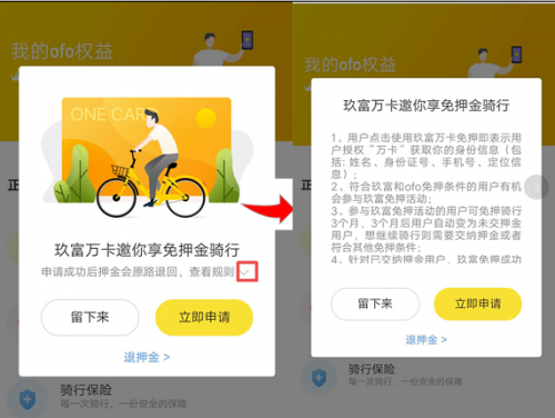 2、符合玖富和ofo免押条件的用户有机会参与玖富免押活动;