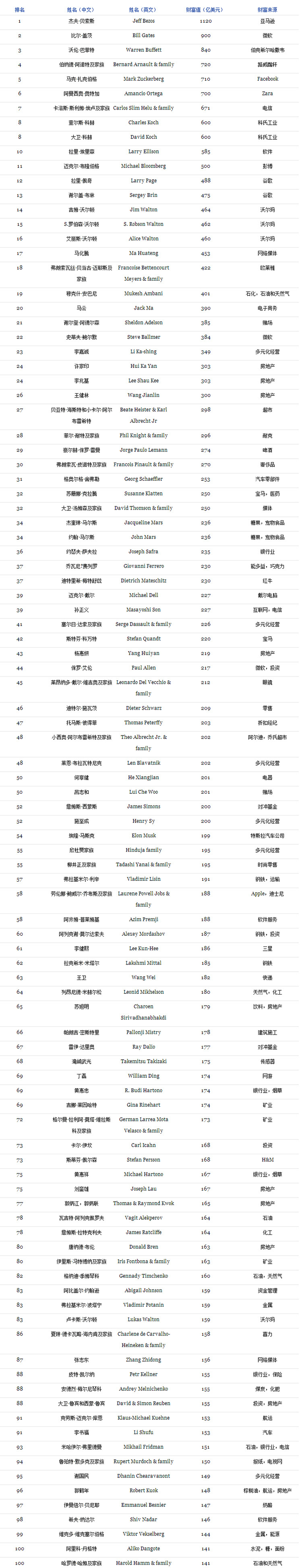 Facebook的马克·扎克伯格排名第五,身家为710亿美元。西班牙服装零售商阿曼西奥·奥特加排名第六,自2011年以来首次掉出前五,他名下的服装连锁品牌Zara广为人知。