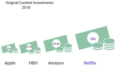 奈飞在原创内容方面远胜过所有竞争对手,通过下图可知,公司未来投入的80亿美元完爆亚马逊的45亿以及HBO的25亿。